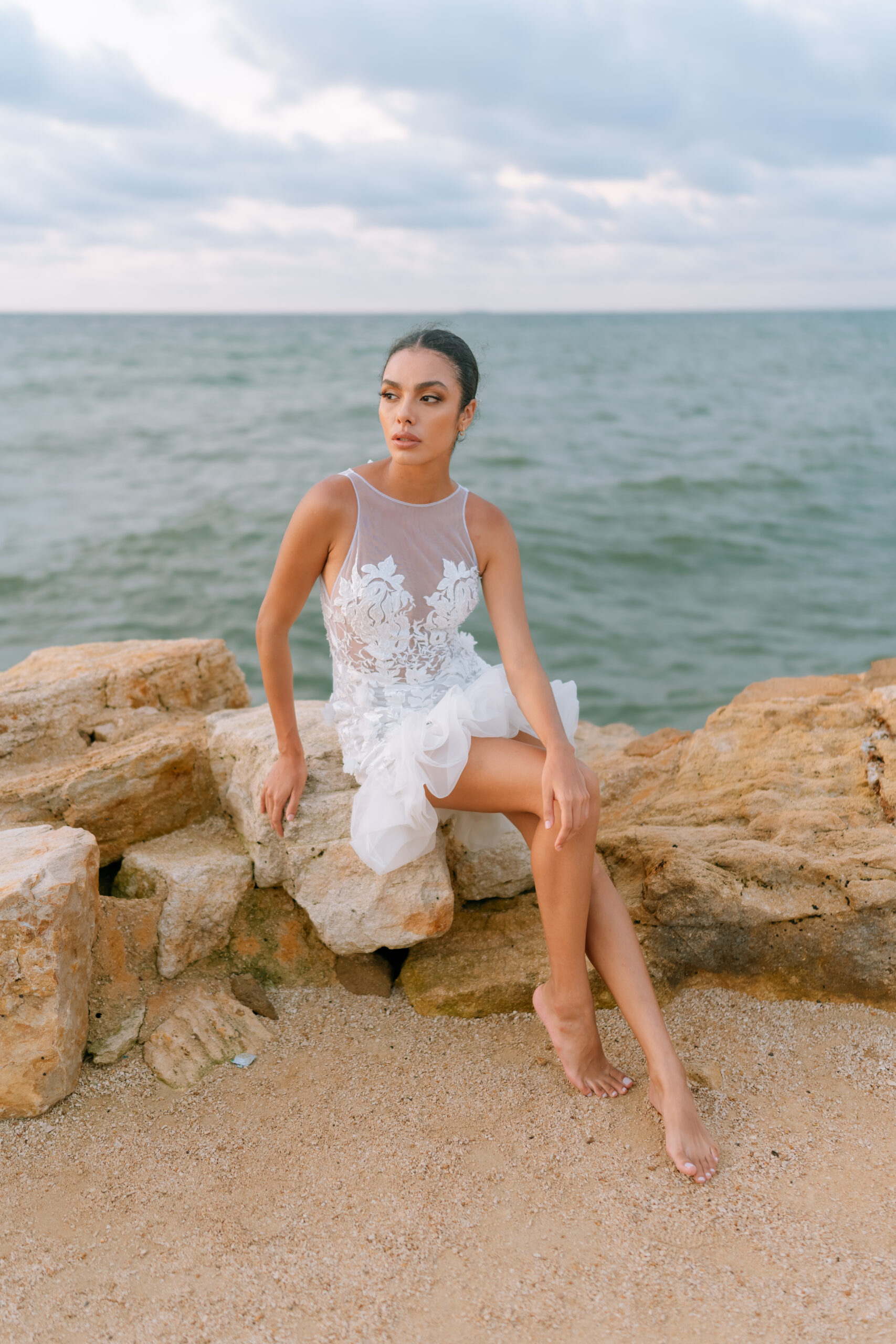 El vestido «Luz Serena» es una manifestación poética de la biodiversidad que florece bajo la calma del Golfo de Morrosquillo. Confeccionado en una base de tul que ajusta a la figura con una ligereza etérea.