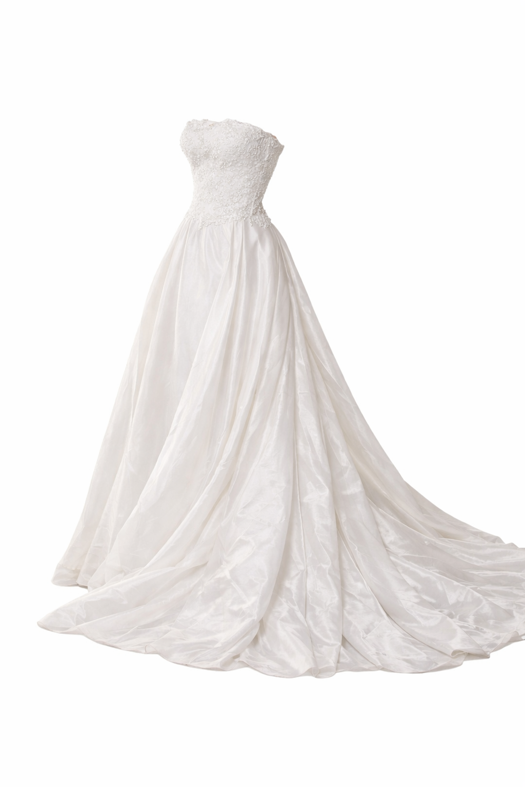 Su diseño es una mezcla de modernidad y romance clásico, tiene un escote strapless con un cuello doblado off-shoulder, que aporta una estructura sofisticada. Los cortes laterales del corpiño están decorados con tul bordado.