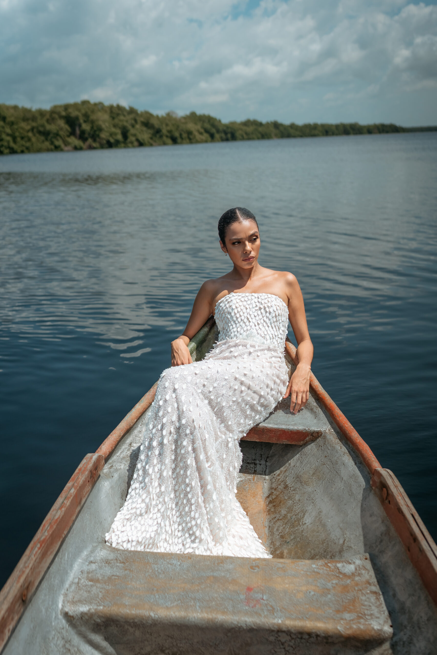 El vestido «Nácar Marino» es una pieza de fantasía que evoca la riqueza marina del Caribe. Su silueta de corte sirena cae elegantemente, creando una línea alargada y sofisticada. La base del vestido está recubierta por un sutil bordado de lentejuelas y aplicaciones que aportan un brillo delicado y continuo.