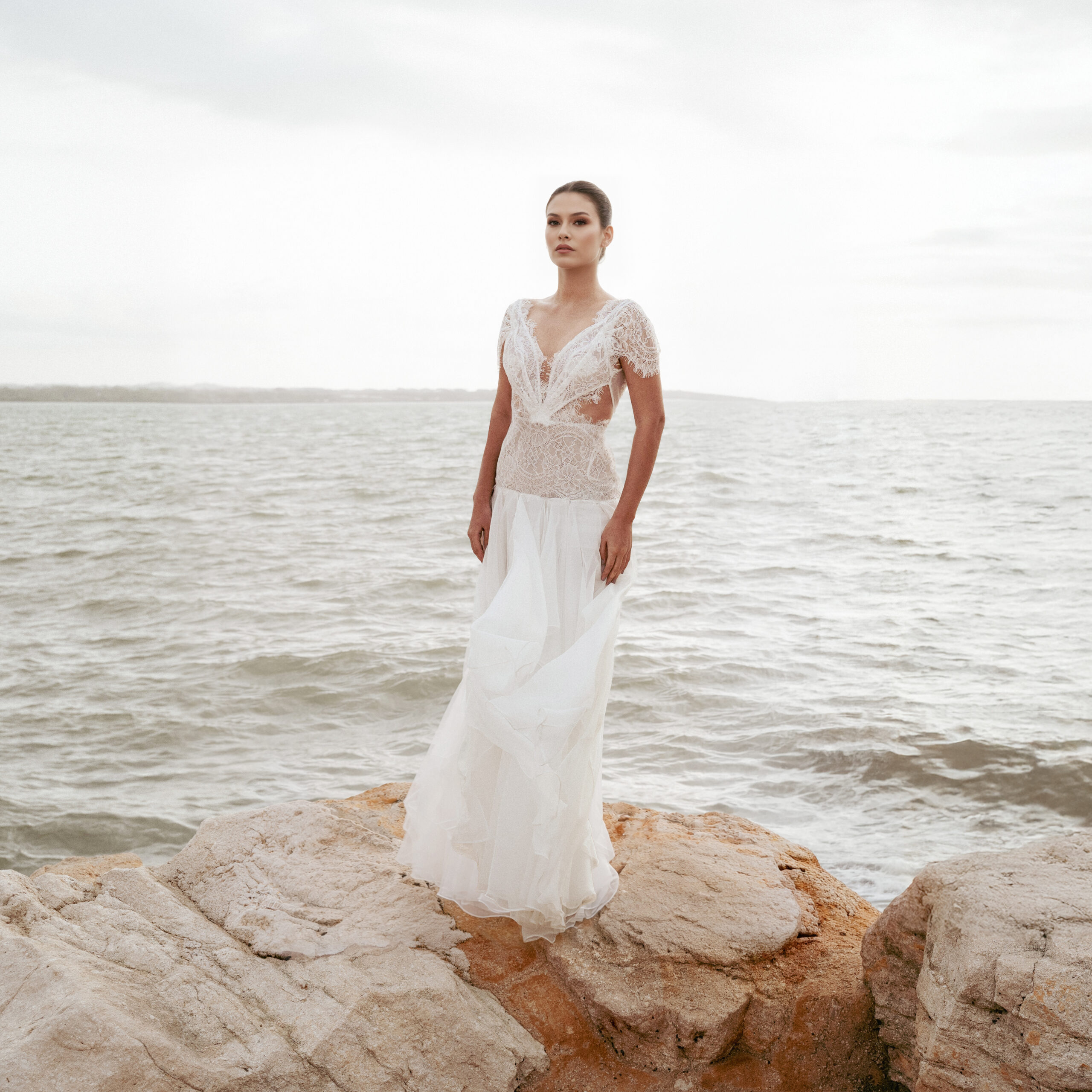El vestido «Ola de Encaje» es una celebración a la sensualidad, inspirado en el movimiento de las olas caribeñas.