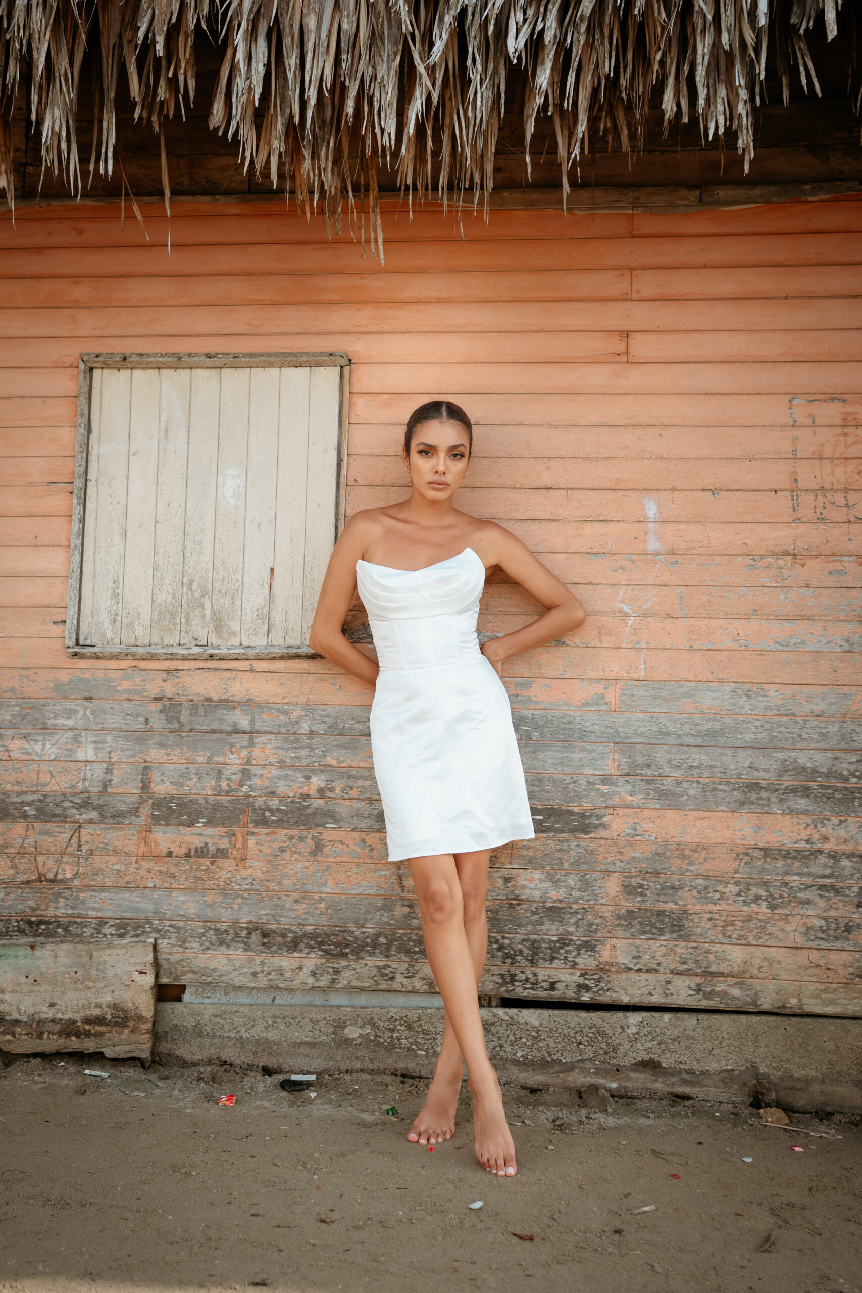 El vestido «Serenidad Marina» es una pieza que celebra la calma y la belleza esencial. Su bustier estructurado, con delicados pliegues que enmarcan el escote, realzan la silueta con precisión y feminidad. La falda corta, de caída limpia y fluida, aporta equilibrio entre modernidad y sofisticación.